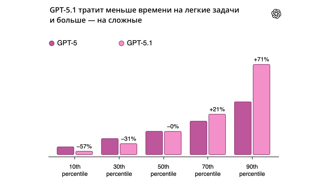 График, показывающий разницу в скорости ответа GPT-5.1 и GPT-5 на задачи разного уровня сложности. Чем выше перцентиль, тем сложнее задачи