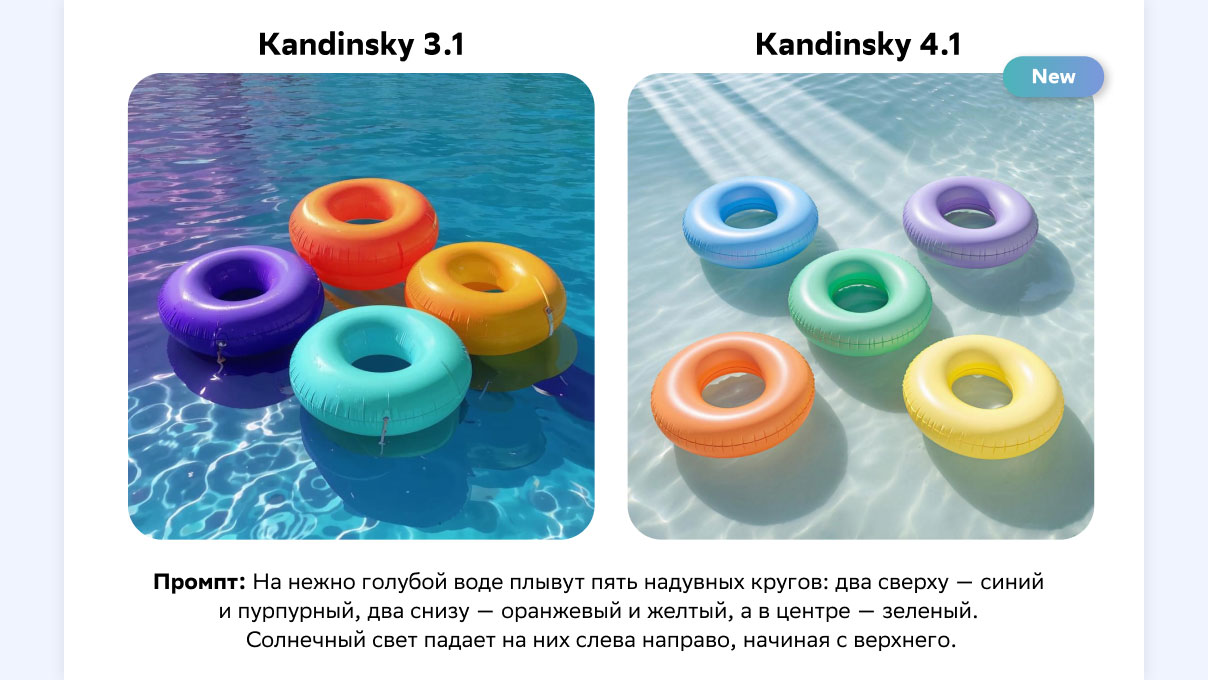 Помимо роста качества, Kandinsky 4.1 стала работать почти в четыре раза быстрее благодаря оптимизации обучения и уменьшению размера модели. Существенно улучшились соответствие промпту, корректность деталей на изображении, а также чёткость образов из русской культуры. Кроме того, модель научилась лучше генерировать текст на изображениях и создавать целые логотипы.