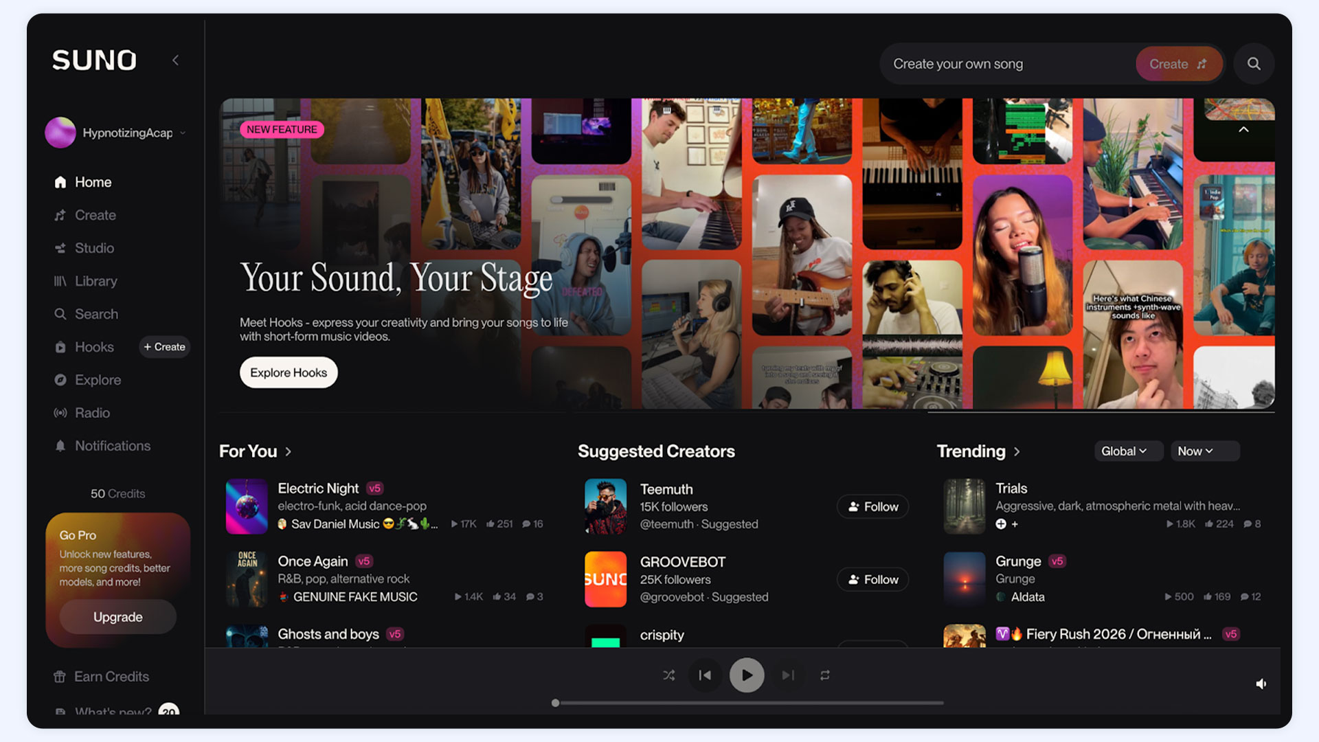 - Suno AI приобрел вирусную популярность благодаря своей способности удивительно точно воплощать текстовые запросы в готовые песни. Пользователь описывает желаемый стиль, настроение и даже содержание текста, а Suno генерирует готовый трек с мелодией, инструментами и вокалом. Сервис работает по условно-бесплатной модели: каждый день пользователям доступны 50 кредитов для экспериментов — этого хватит на 10 треков.