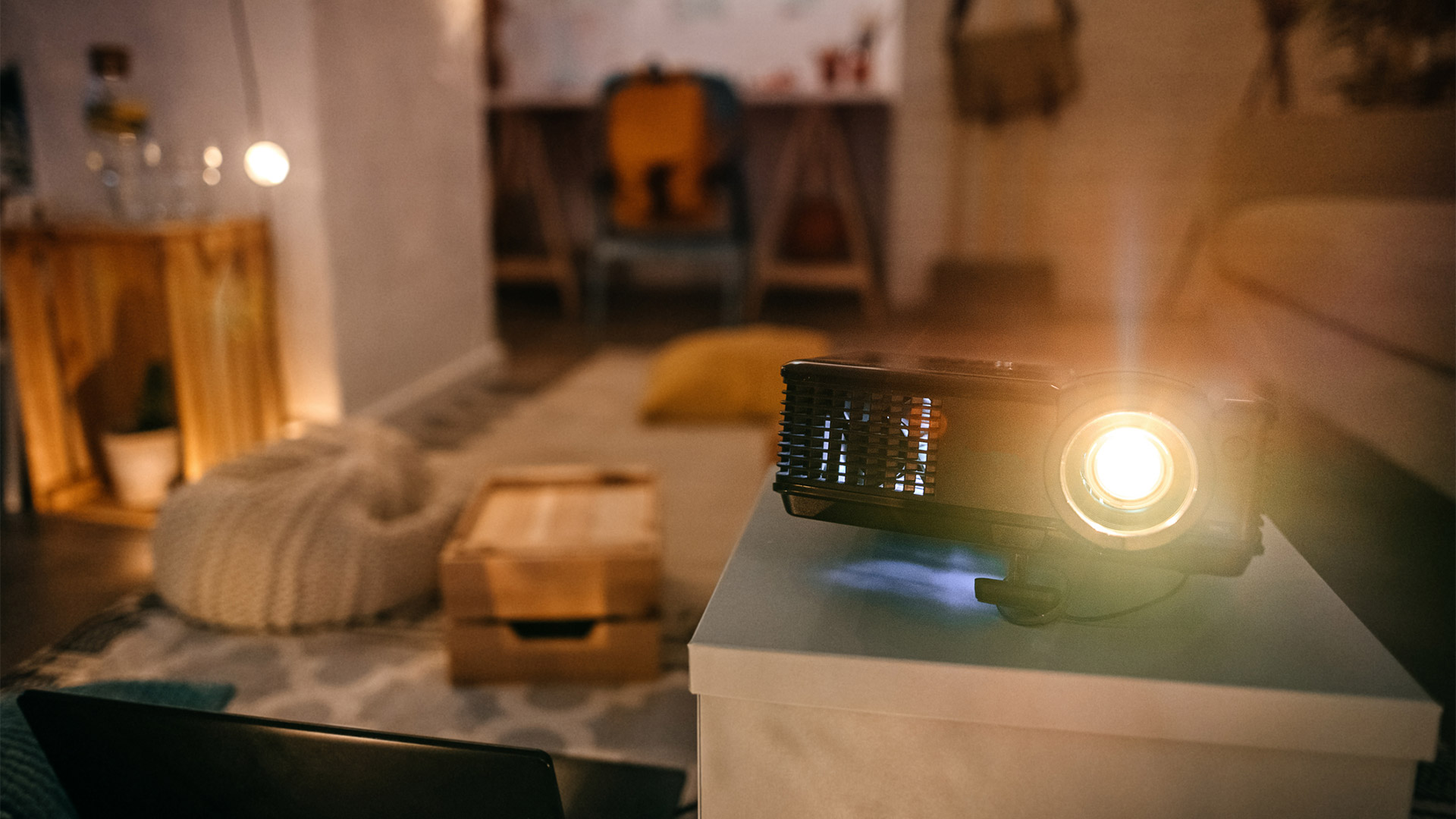 Проектор не занимает много места и не доминирует в интерьере: нет огромной чёрной панели на стене. Его можно переносить из комнаты в комнату, хранить в шкафу или поставить на полку.