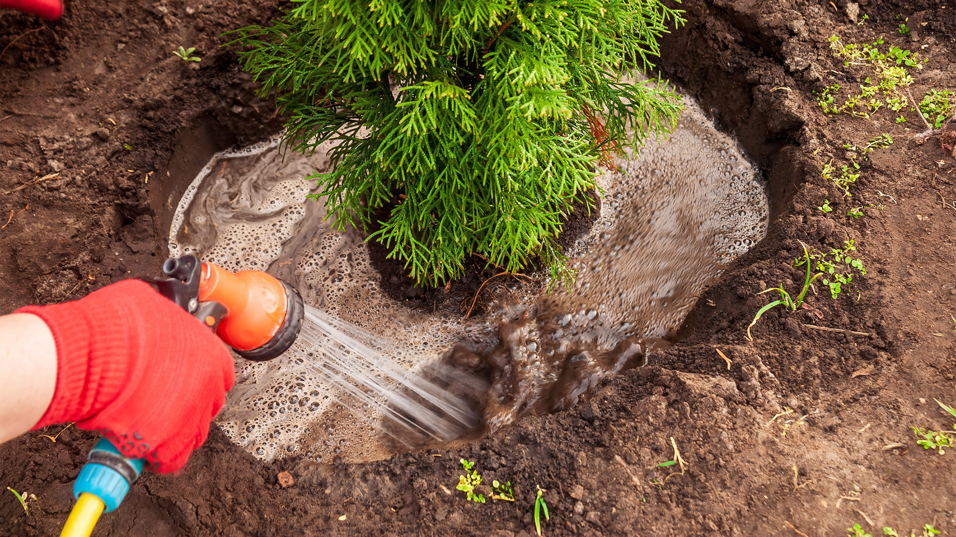 - Поливайте деревья по 1–1,5 часа, кустарники — по 30 минут.
