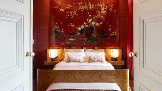 Текстильное панно «Пчела» от современной потомственной художницы Марии Арендт и антикварный секретер эпохи шведского рококо с ромбами в технике маркетри в интерьере по проекту Евгении Ходаковой.