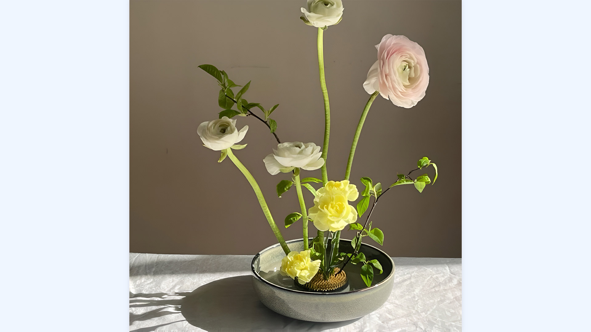 «Кензан встраивают в невысокие вазы — до 25 сантиметров, — кашпо или глубокие тарелки. С его помощью создают минималистичные букеты, иногда с добавлением извилистых коряг, которые буквально парят над поверхностью. Для таких композиций идеально подходят цветы с графичными линиями: ранункулюсы, хризантемы, ирисы, ветки сливы или цветущей вишни», — рассказывает эксперт.