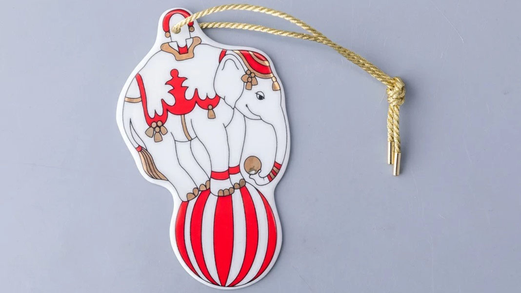 Игрушка из костяного фарфора Императорского фарфорового завода входит в коллекцию Grand Cirque Vintage. Художник Любовь Цветкова вдохновлялась афишами Цирка Чинизелли начала XX века. Слон на шаре выглядит как музейный экспонат и продаётся в подарочной упаковке.