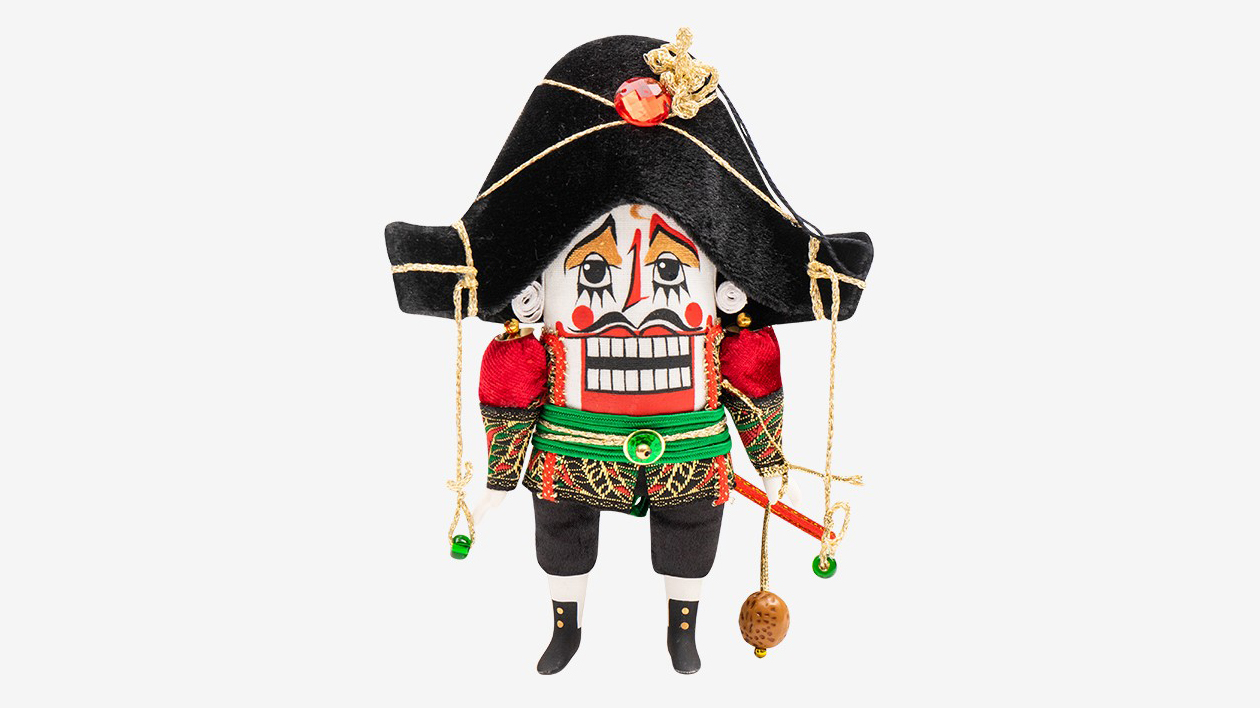 Музей «Эрмитаж» в этом году представил коллекцию игрушек по мотивам сказки «Щелкунчик». Ёлочная игрушка в виде главного персонажа выполнена из текстиля, тесьмы и бусин. Щелкунчик с грустными глазами, но очень нарядный. Он понравится и фанатам сказки, и тем, кто ценит ручную работу.