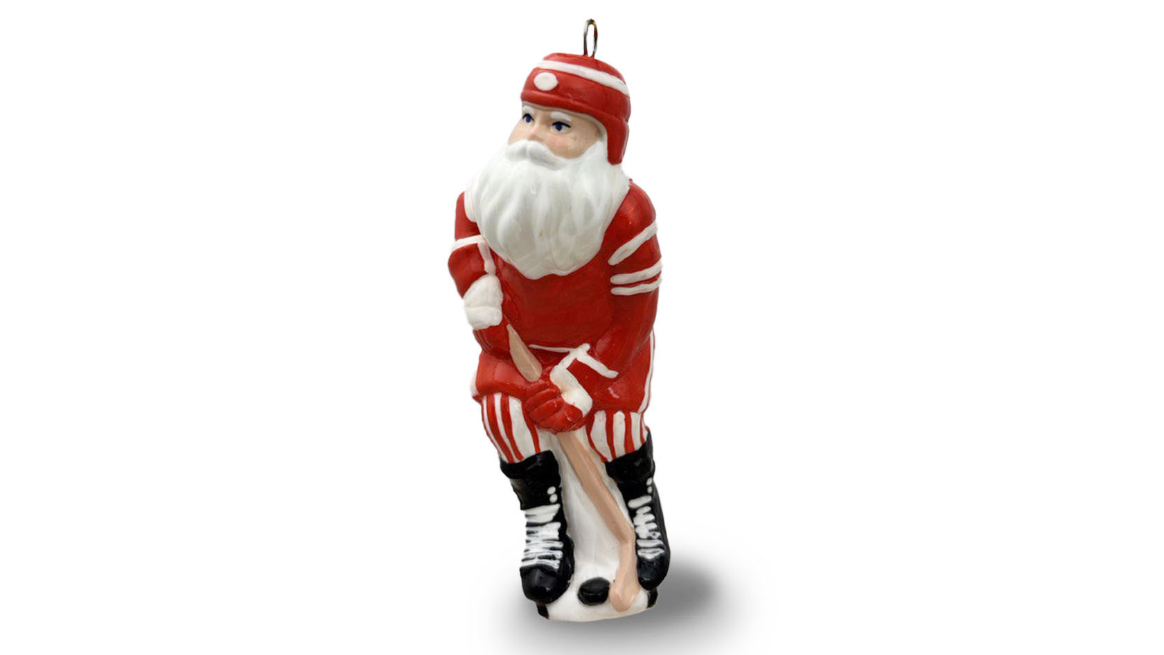 Дед Мороз в роли хоккеиста от фабрики «Ленигрушка» — находка для тех, кто любит спорт и советскую эстетику. Красная форма с номером 17 отсылает к легендарному Валерию Харламову, а сам образ выполнен в ретростиле. Такая игрушка одинаково хорошо впишется и в ностальгическую ёлку, и в ироничную современную.