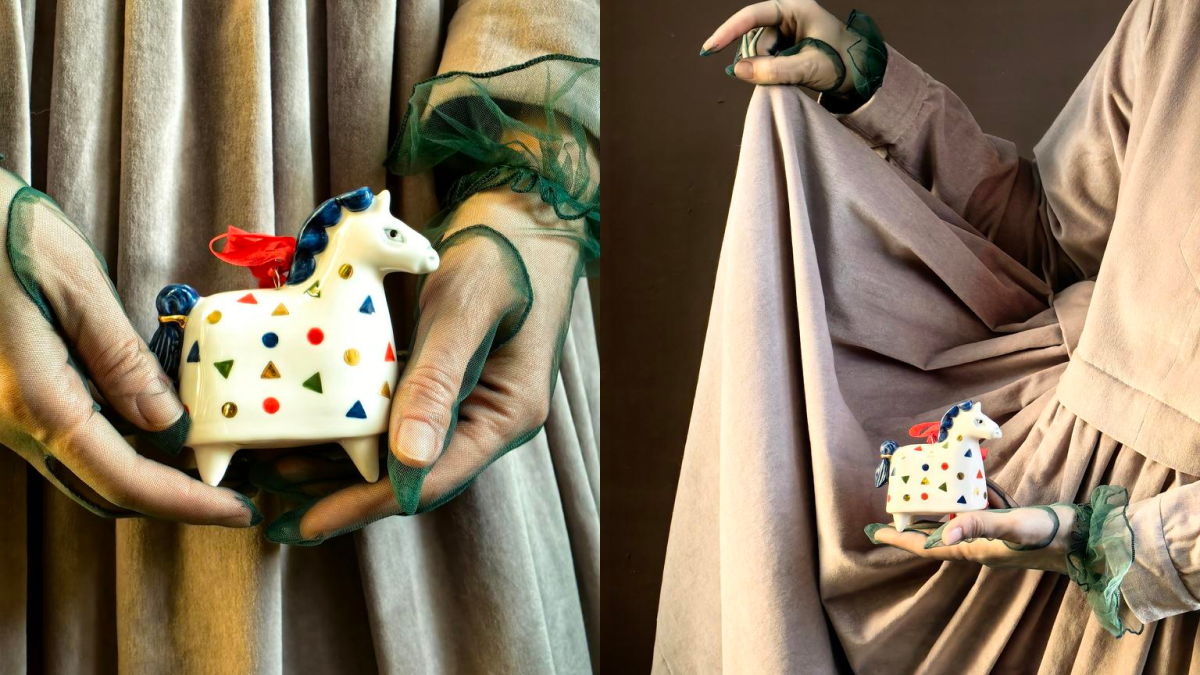 Конь в пёстрой попоне выполнен из глазурованного фарфора по дизайну Артемия Таволжанского на иркутской фабрике «Красно». Эффектная фигурка может служить и ёлочным украшением, и небольшой статуэткой.