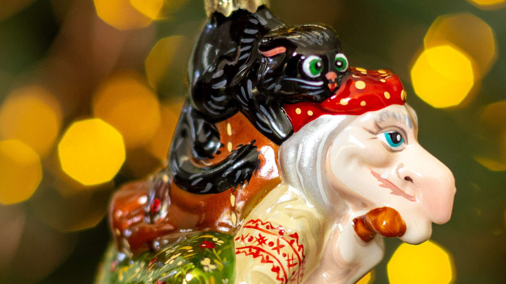 Екатеринбургская фабрика XMAS TOYS выпускает стеклянные игрушки ручной работы. Одна из самых ярких серий — «Сказочная нечисть», в том числе симпатичная Баба-яга, летящая в ступе с чёрным котом за спиной. Она не пугает, а выглядит очаровательно.