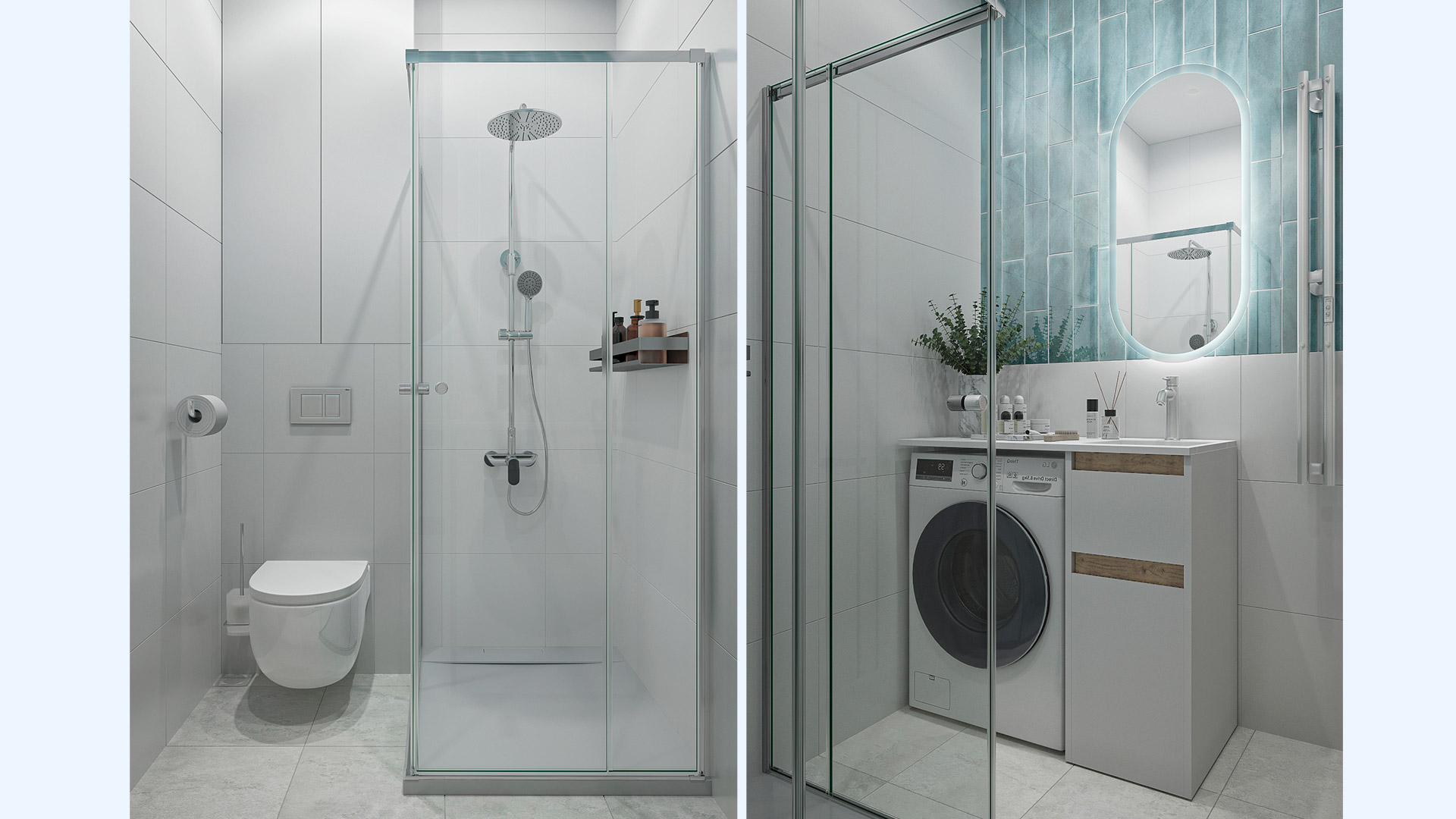 Визуально расширить пространство получилось за счёт белого цвета и небольшого акцентного участка светло-голубой плитки. На полу уложили керамогранит светло-серого, почти белого оттенка.