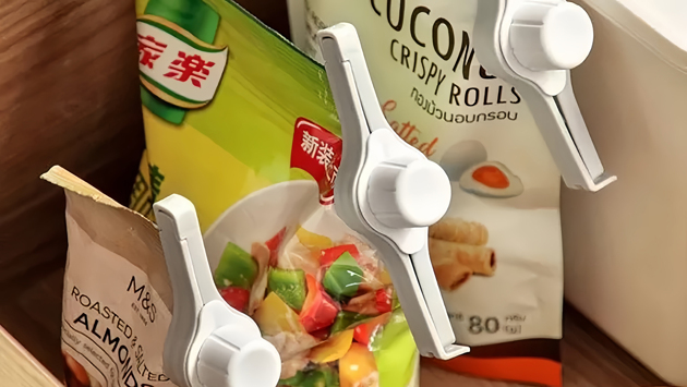 Маленькие пластиковые или силиконовые клипсы с «горлышком» крепятся на заводскую упаковку сахара, гречки и любых других сыпучих продуктов. Для того чтобы высыпать содержимое, эту клипсу даже не надо снимать, достаточно открыть «горлышко». Больше не нужно завязывать узлы, пересыпать крупы в банки или искать прищепки — просто защёлкнул, и содержимое остаётся в надёжной упаковке.
