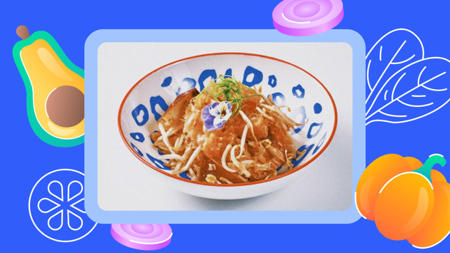 - Приготовьте острый маринад. Для этого чеснок, перец чили, красный лук, корень имбиря порежьте мелким кубиком. В 400 мл тёплой кипячёной воды растворите сахар, добавьте соевый соус, сок юдзу и уксус. Так как в составе маринада достаточно много сахара, возьмите соевый соус, в составе которого его нет. Добавьте в маринад нарезанные овощи и хорошо перемешайте.
