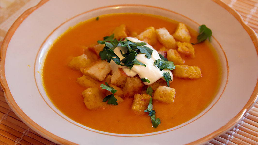 - Разлейте морковный суп-пюре по тарелкам, в каждую тарелку положите по кусочку хлеба, а сверху на него — ложку сметаны и немного рубленой кинзы. Готово.
