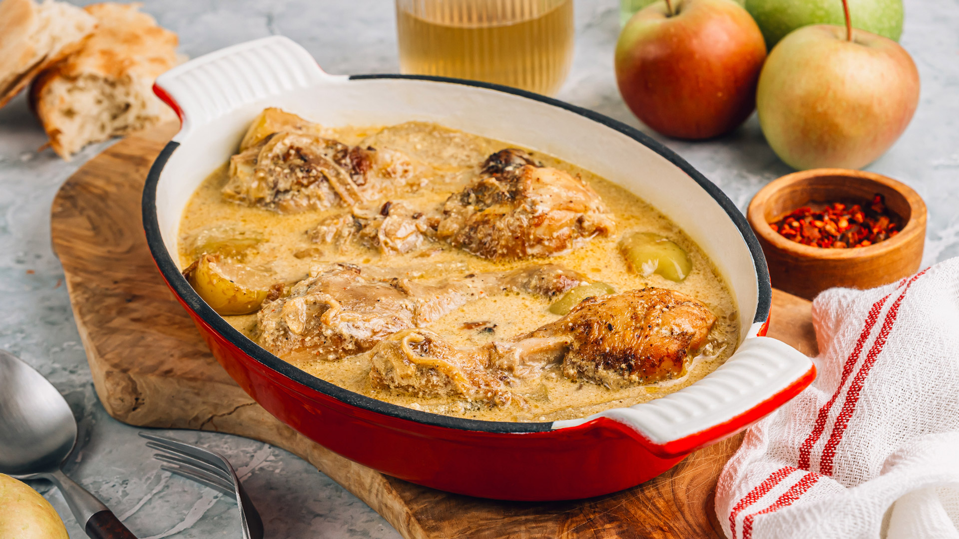 Курица по-нормандски с яблоком и грудинкой в духовке