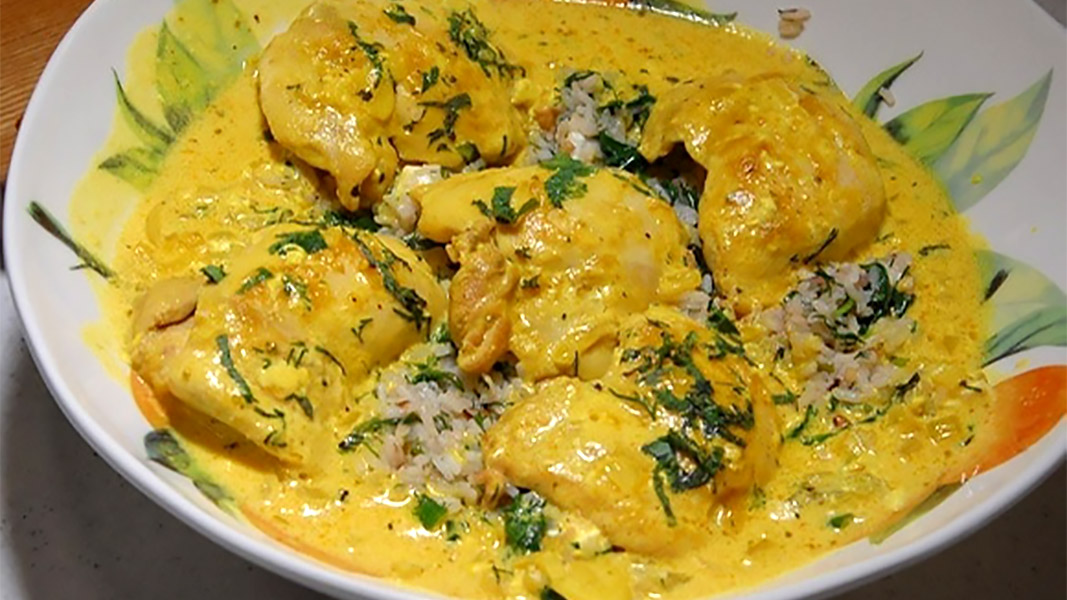 Это индийский вариант приготовления курицы с большим количеством пряностей. Мясо птицы сначала обжаривают, а потом доводят до готовности в бульоне, йогурте и сливках. Так получается яркий и нежный соус.