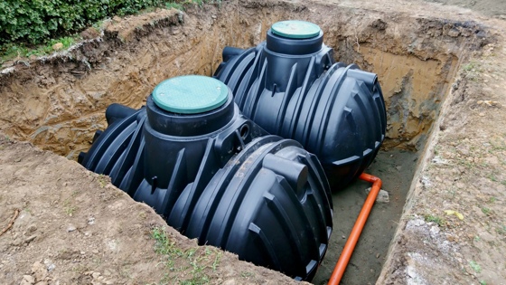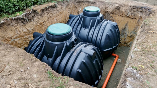 В доме для постоянного проживания семьи лучше сразу вложиться в качественный септик или станцию биологической очистки. Требования к его расположению те же, что и для выгребных ям, только расстояние до границ участка может быть меньше — до 1 метра. Септик тоже должен быть заглублён ниже глубины промерзания. Если при этом он оказывается ниже максимального уровня грунтовых вод, бетонные кольца не годятся — подходит только цельная герметичная конструкция. Такой септик должен быть рассчитан на возможность установки ниже уровня грунтовых вод, и его следует якорить в земле, чтобы предотвратить всплытие.