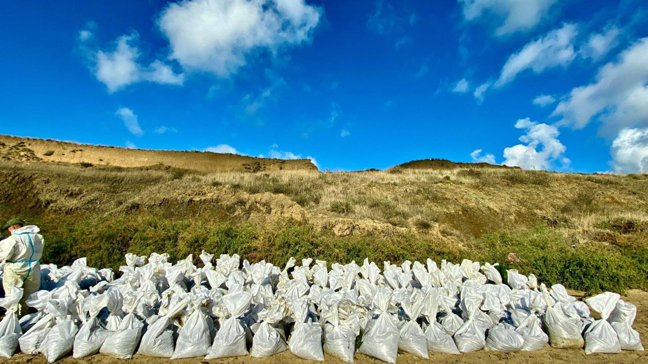 Побережье в Темрюкском районе — от Благовещенской до Крымского моста — убирать можно только вручную. Это пляжи с перепадом высот до 90 м и подъёмом до 35–45 градусов. Подъехать технике к морю практически невозможно. Волонтёрам штаба «Дельфины» помогает вездеход «Пионер» — только он может преодолеть трудности местности и поднять с пляжей собранный мазут.