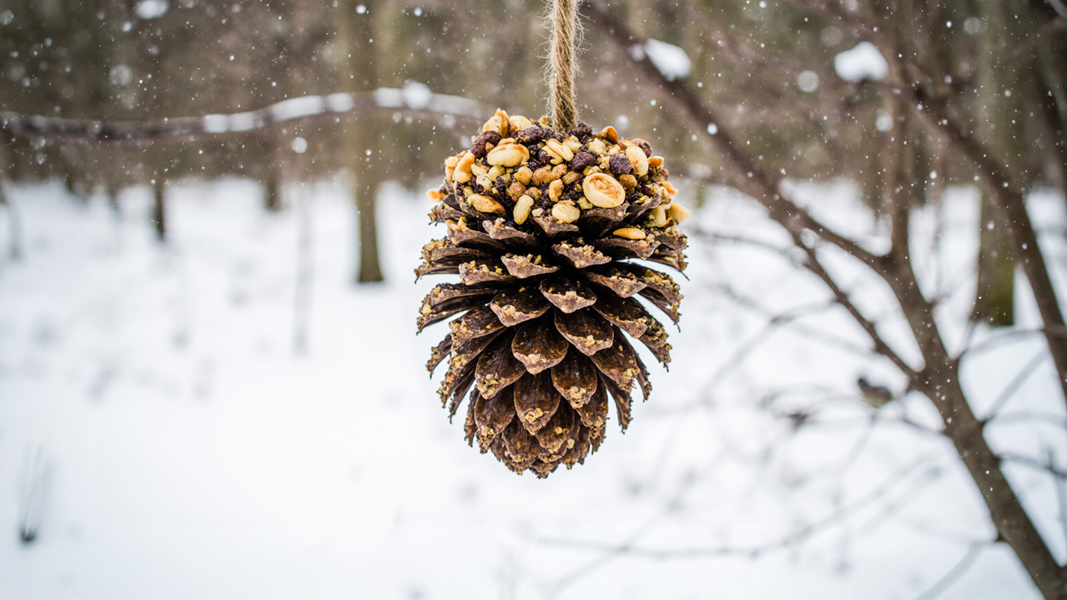 Природная ёлочная игрушка для птиц — шишка, покрытая зерновой смесью и жиром, — требует небольшой подготовки.
