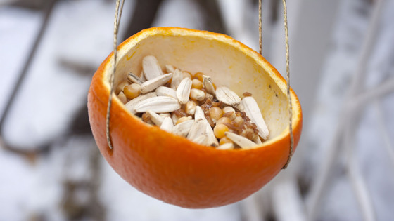 Сочные апельсины и грейпфруты сами по себе птицам не нужны, но их кожуру удобно использовать как тарелочку для семечек и зёрен. Такая кормушка смотрится ярко и симпатично, а после того, как упадёт на землю, тоже разложится.