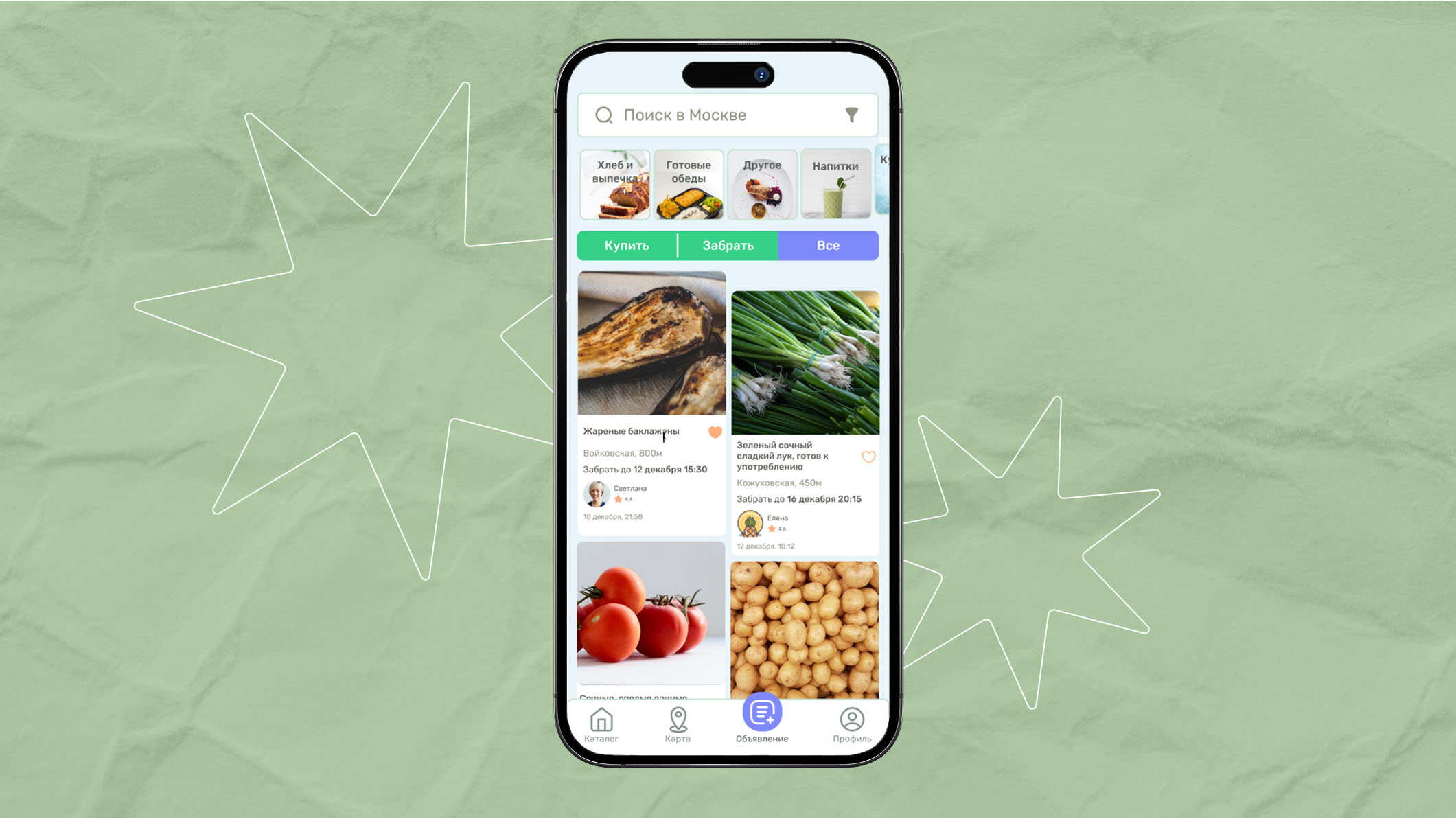 Приложение помогает делиться лишними продуктами или искать бесплатную качественную еду. В интуитивно понятном интерфейсе просто создать объявление и предложить запечатанные продукты или готовые блюда. Также в приложении видно, какую еду можно забрать и как далеко за ней надо идти или ехать.