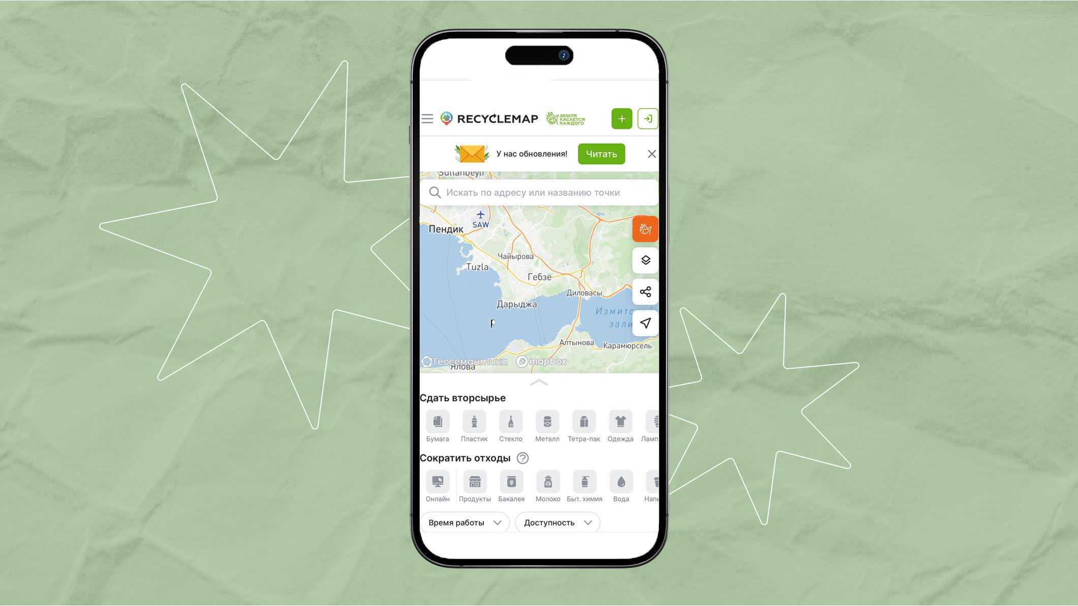 Recyclemap — это удобная карта, на которой отмечены тысячи пунктов приёма вторсырья по всей России. Сервис помогает быстро найти ближайшее место, где принимают отходы на переработку. Пункты можно отфильтровать по разным видам вторсырья: всего 13 категорий, в том числе опасные и редкие отходы.