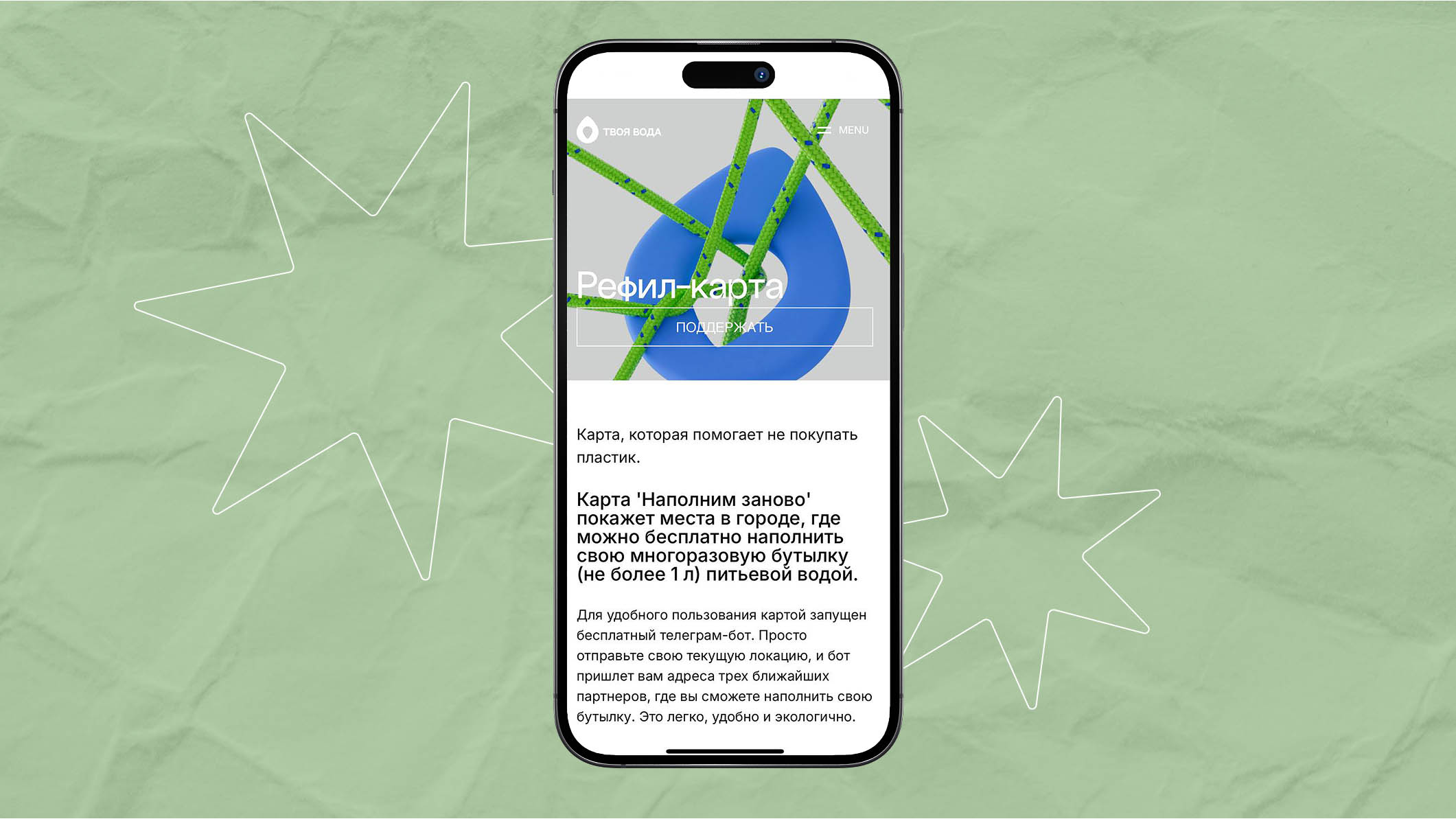 Если вы хотите сократить количество пластиковых бутылок и готовы ходить с многоразовой, вам пригодится рефил-карта «Твоя вода». Она показывает, где можно бесплатно наполнить свою тару (до 1 л) чистой питьевой водой. На карте — партнёрские точки в более чем 50 регионах России.