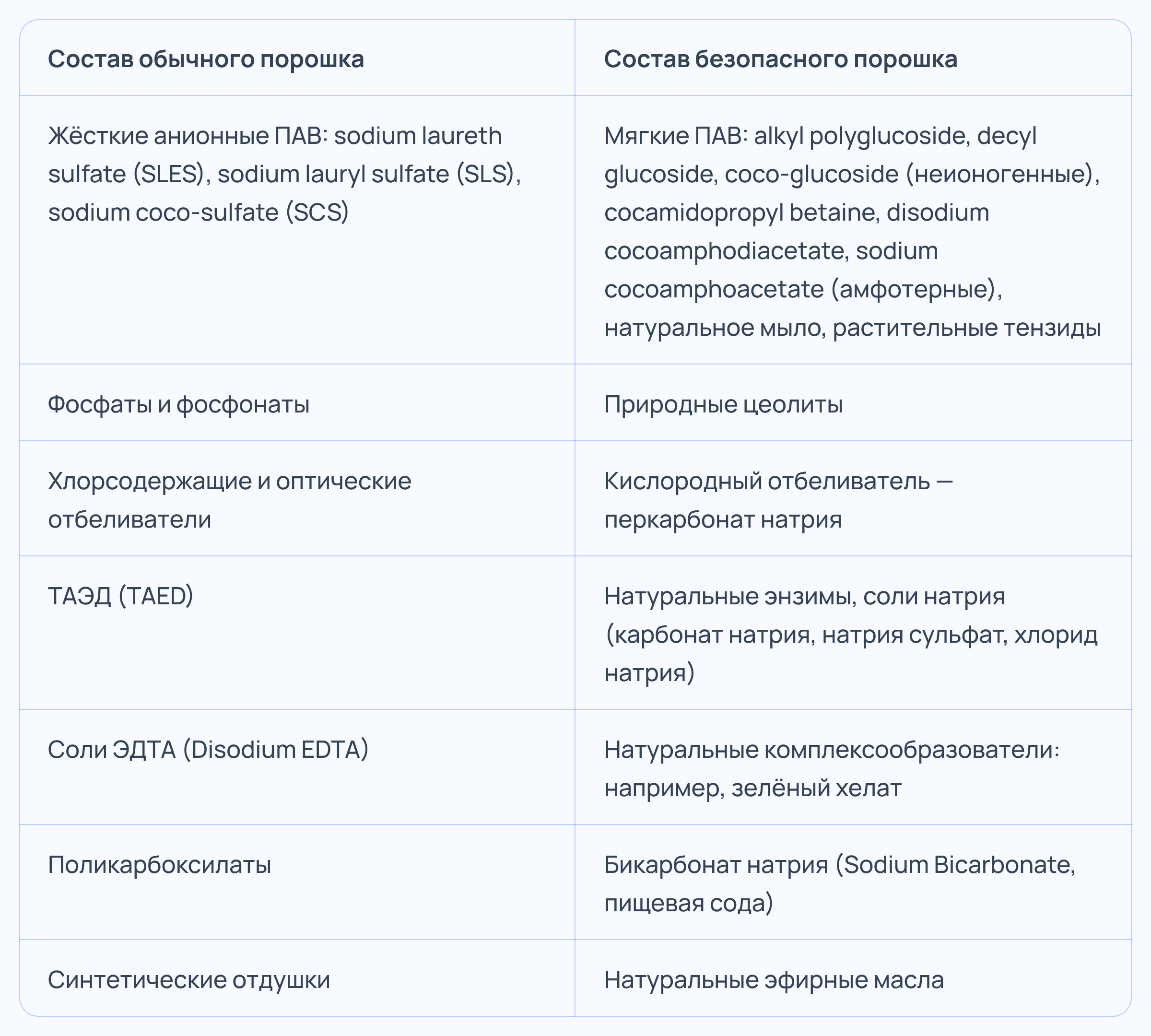 Чтобы выбрать безопасное средство, смотрим на состав: он может быть указан на упаковке на русском и/или английском языке, с расшифровкой или без. В идеале стоит выбирать стиральный порошок без компонентов из списка выше. Он должен быстро растворяться в воде и также легко вымываться из ткани.