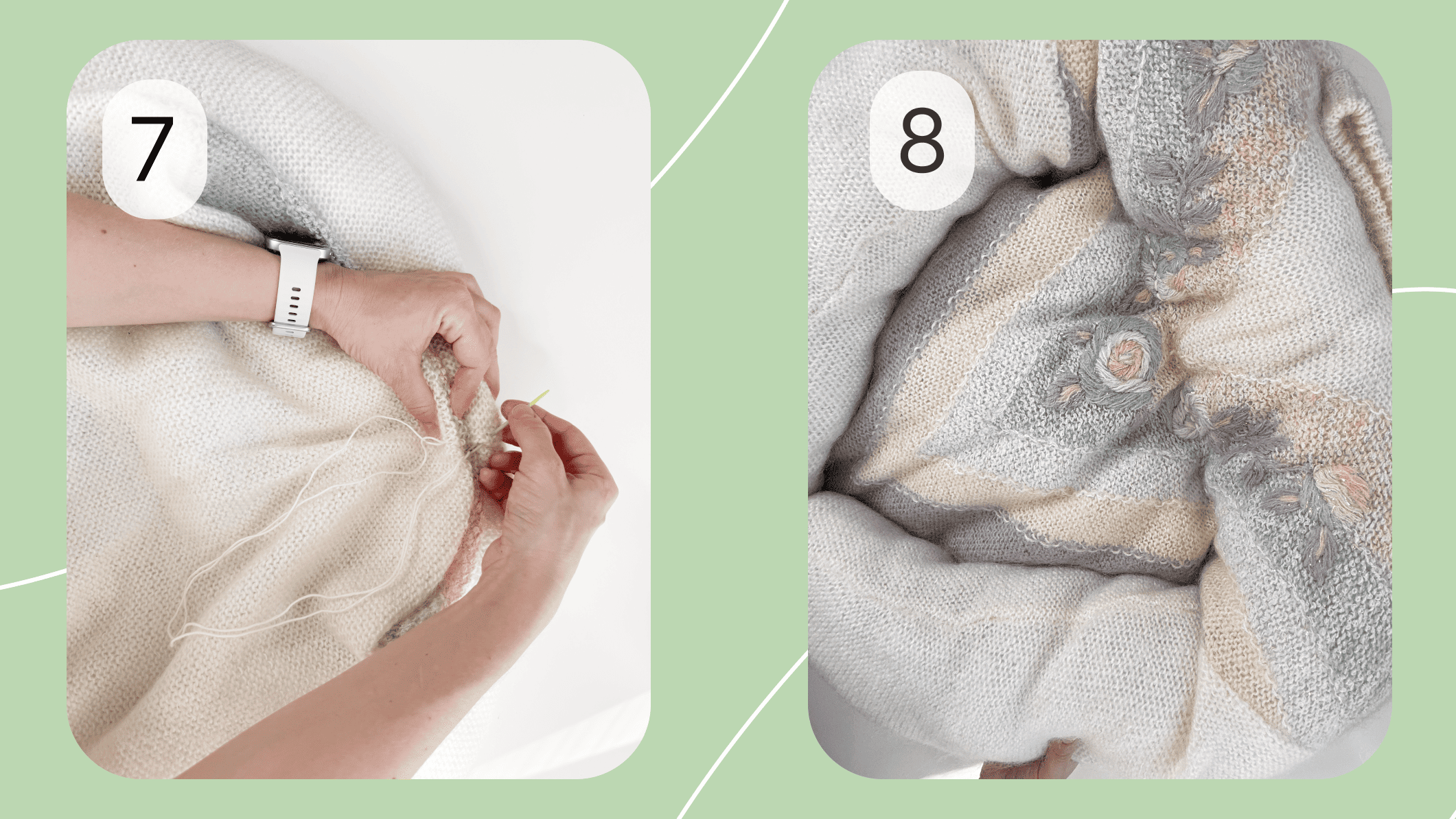 Пришейте подогнутые спинку с передом к «тоннелю» из рукавов (фото 7). Это удобно делать начиная от центра: сначала от середины полукруга к одной подмышке, потом — к другой. Ваша лежанка готова.