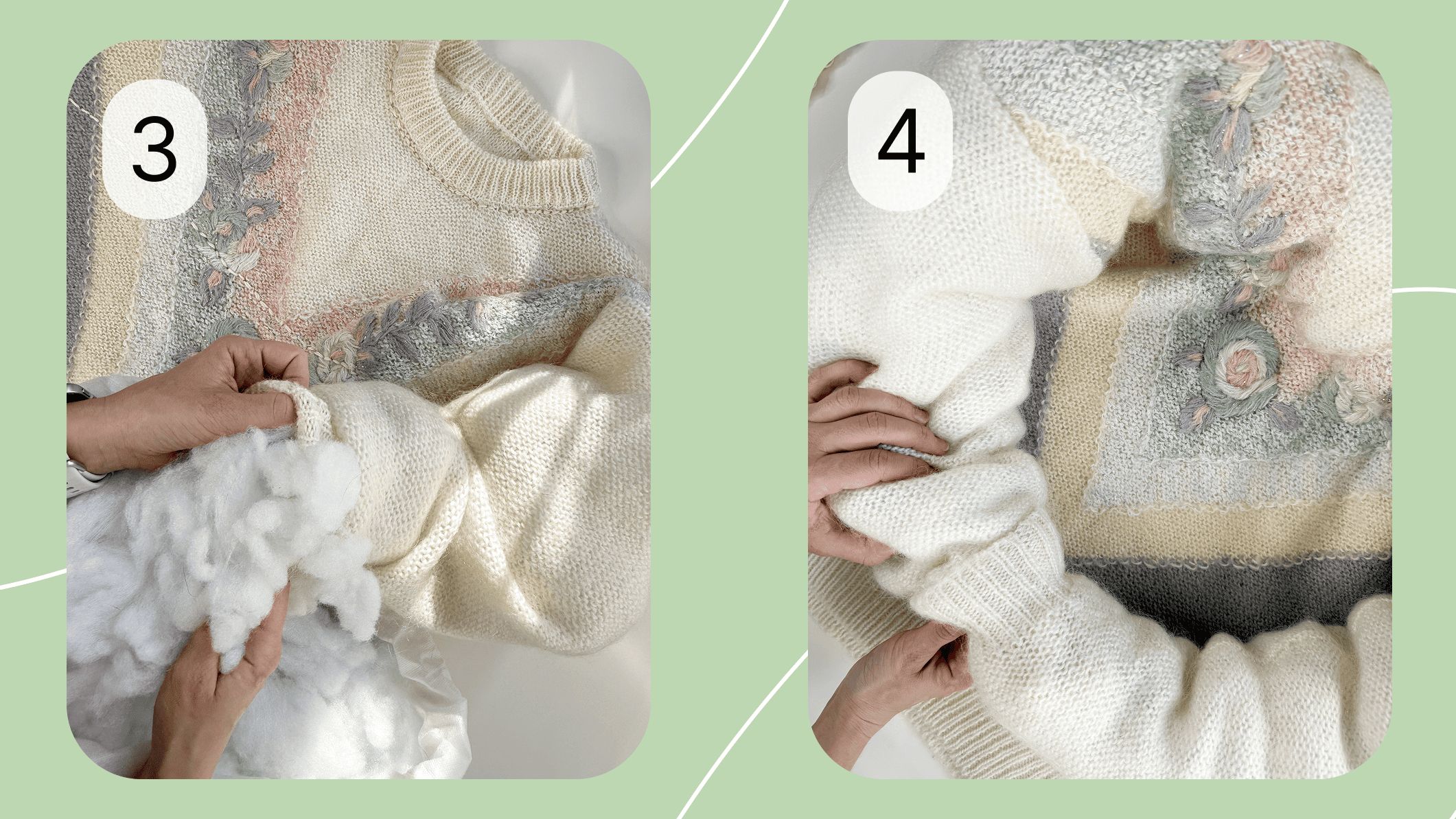 Набейте получившийся «тоннель» холлофайбером. Делать это удобно заполняя пространство сначала через один рукав до основной части свитера, где раньше была горловина, а затем через другой — до той же зоны (фото 3).