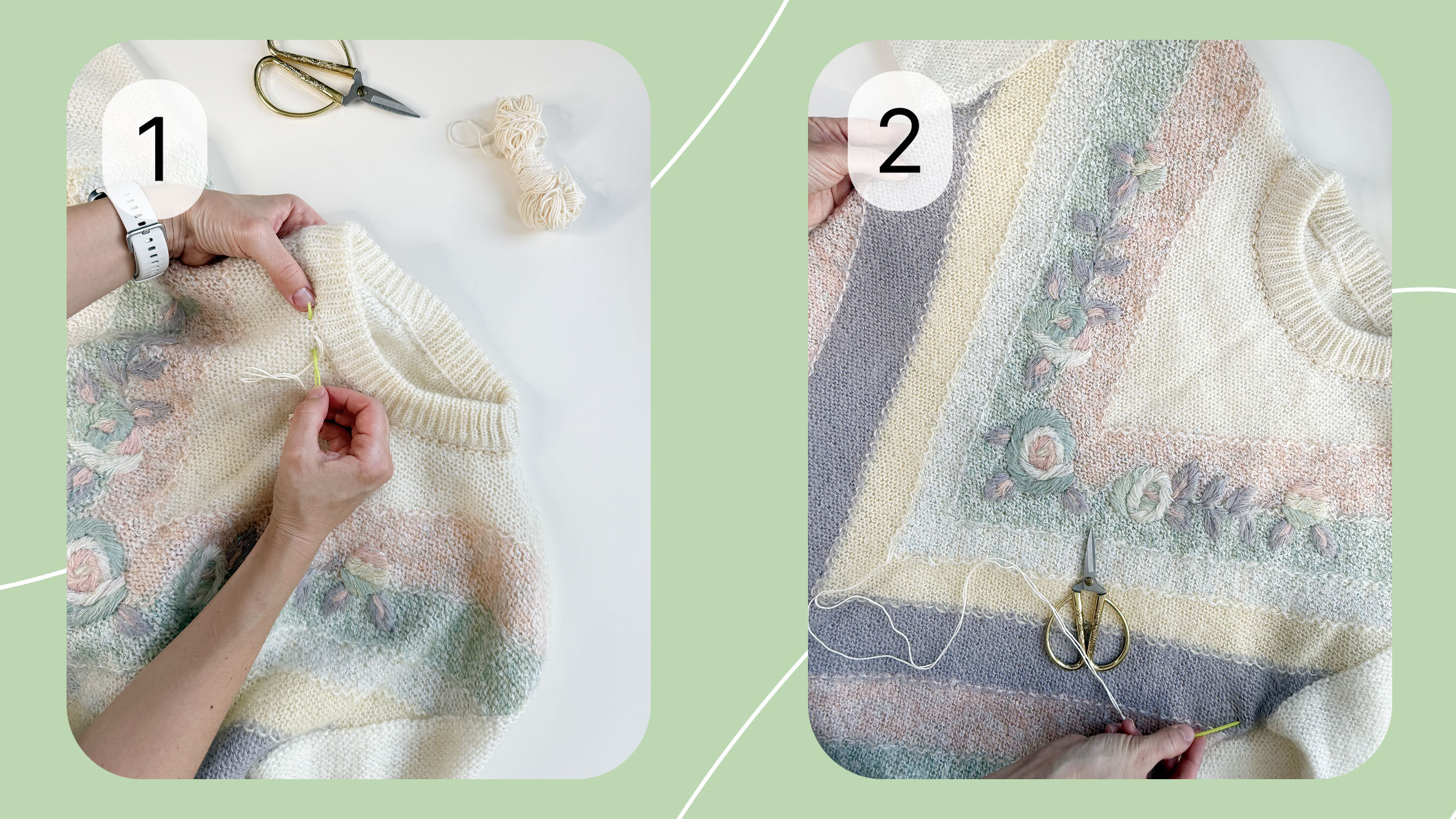 - нитки в тон свитера (если он вязаный, то лучше подобрать нить примерно той же толщины, что и пряжа, из которой связан свитер);