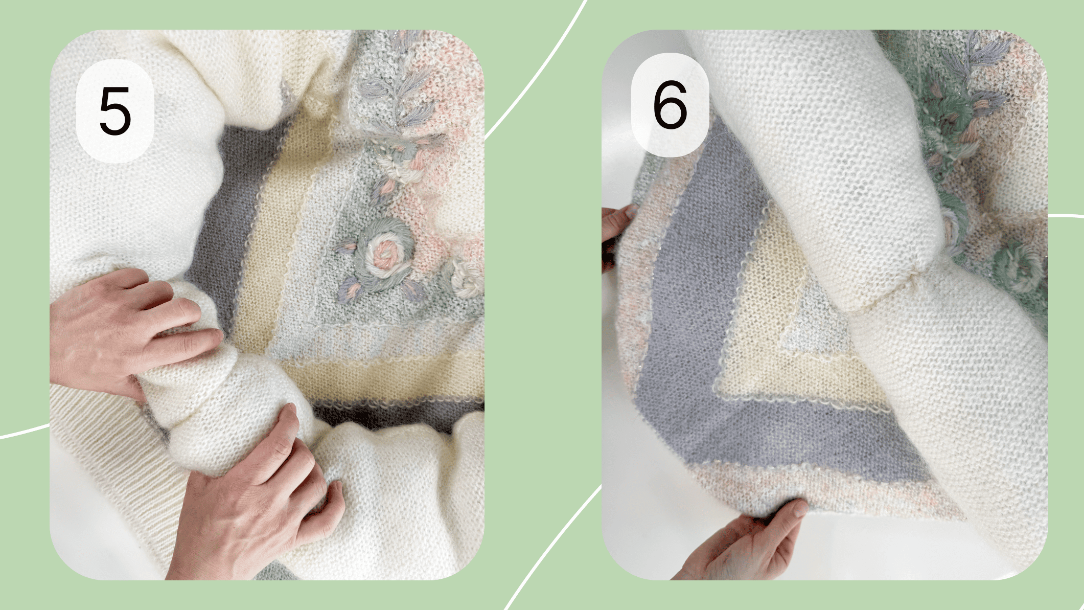 Подогните нижнюю часть свитера (перёд и спинку) таким образом, чтобы получился полукруг и низ не выходил за пределы «стенки» из рукавов (фото 6).
