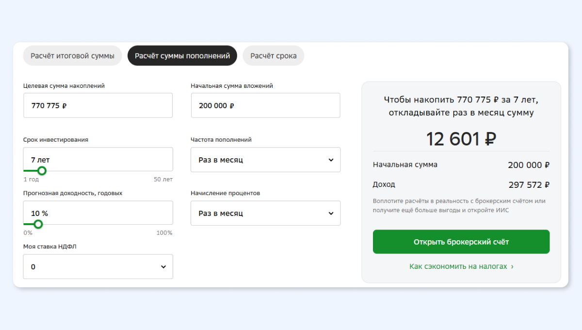 В итоге получаем сумму, которую необходимо откладывать в течение всего срока накопления — 12 601 рубль.