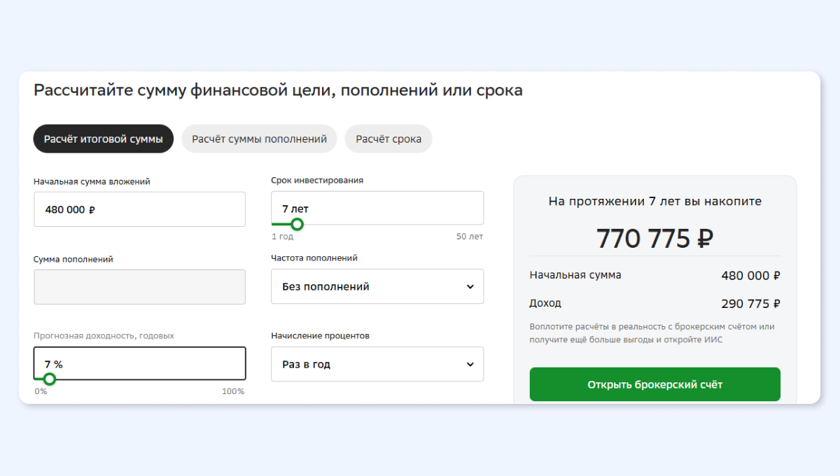 - Срок инвестирования — сколько вам осталось копить. Моему сыну 9 лет. Ему осталось семь лет до техникума, девять — до вуза.