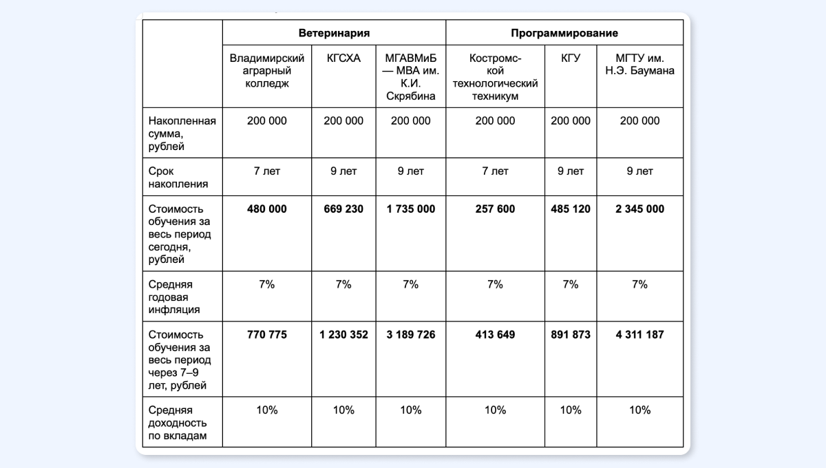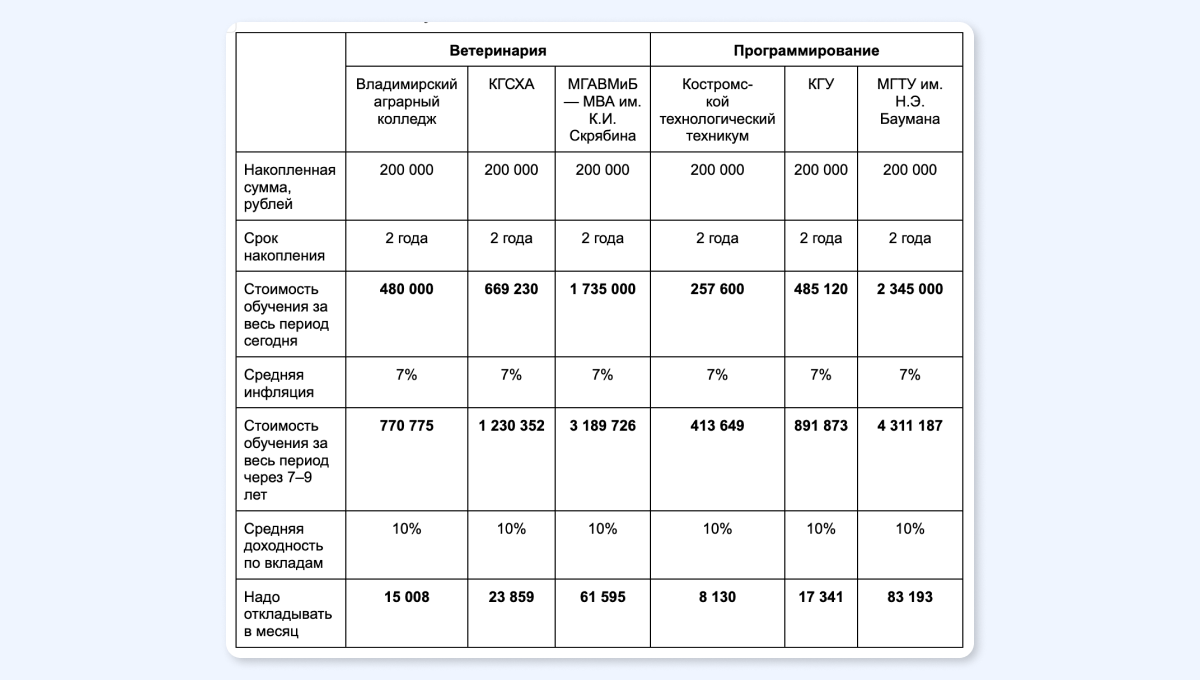 Рассчитаем, сколько нам откладывать в месяц по разным направлениям подготовки и учебным заведениям — от самых дешёвых к самым дорогим.