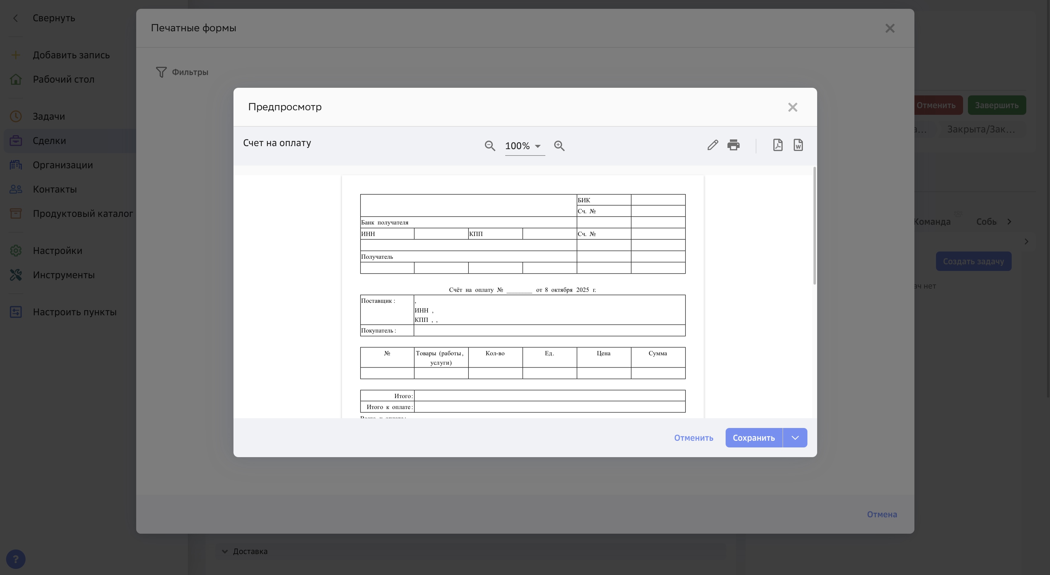 Пример. В рамках сделки сотруднику требовалось подготовить типовой договор. В CRM достаточно один раз создать шаблон документа, после чего система автоматически подставит нужные данные из карточки клиента. Готовый документ можно сразу распечатать, отправить по e-mail или через систему электронного документооборота (ЭДО) — без копирования, форматирования и лишних действий. Это значительно сокращает время: вместо двух часов требуется несколько минут, и снижается вероятность ошибок.