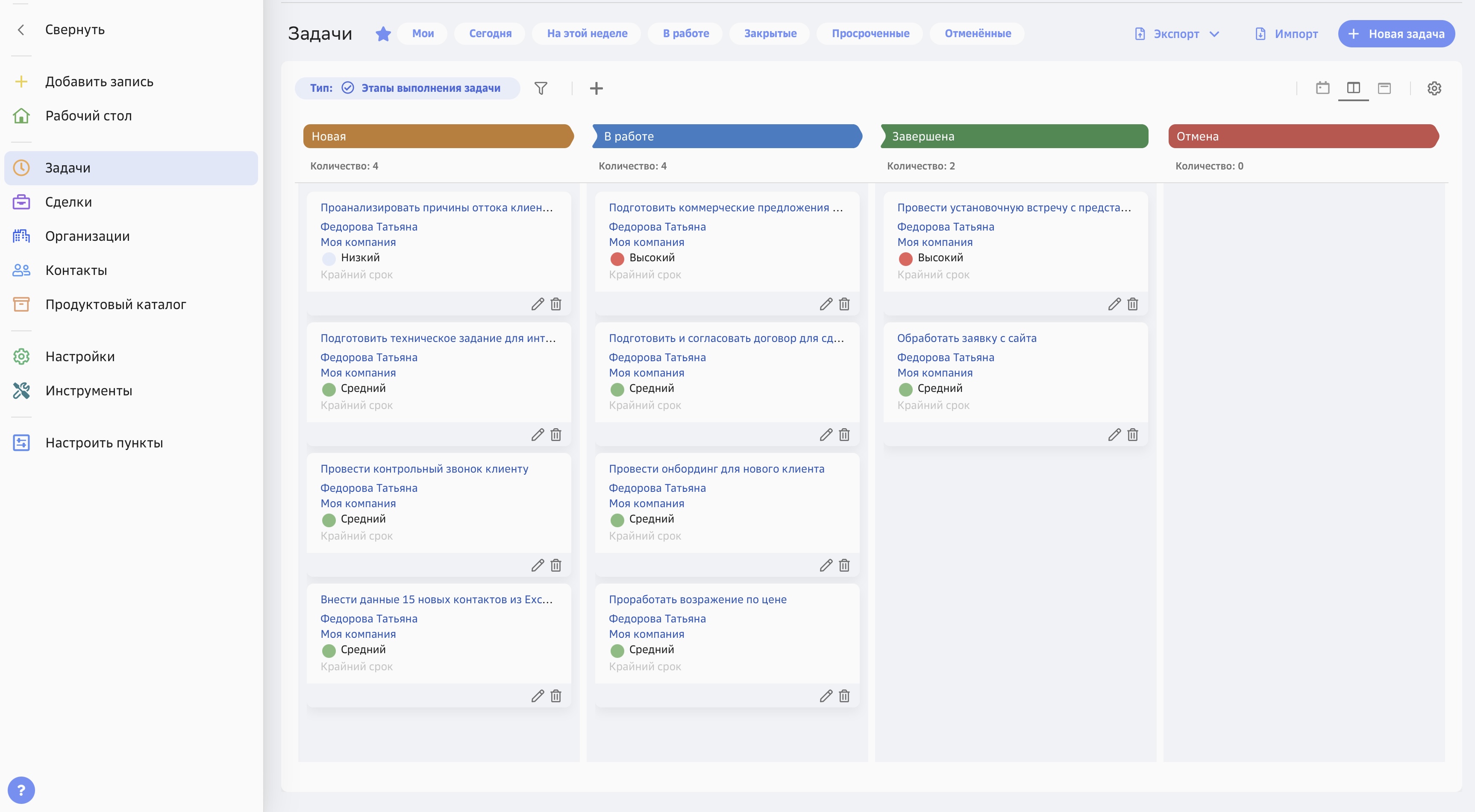 В CRM есть удобные инструменты для приоритизации задач по важности и срокам, настройка персональных напоминаний, фильтрация задач по типу. Все активности отображаются на одном экране — это позволяет быстро ориентироваться в текущей загрузке и не терять фокус.