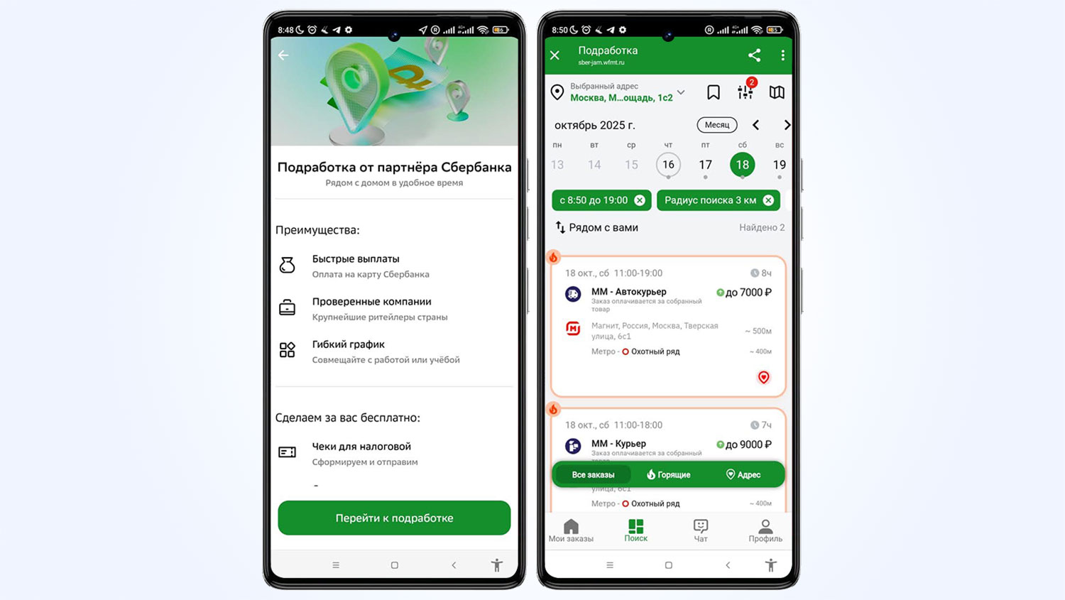 В разделе «Найти заказ» можно искать подработку от партнёров Сбера. В сервисе есть фильтры, которые помогут найти подходящие предложения. Для этого нужно указать город проживания, время работы, тип заказов. Оплата поступает в течение 12–24 часов после выполнения заказа.
