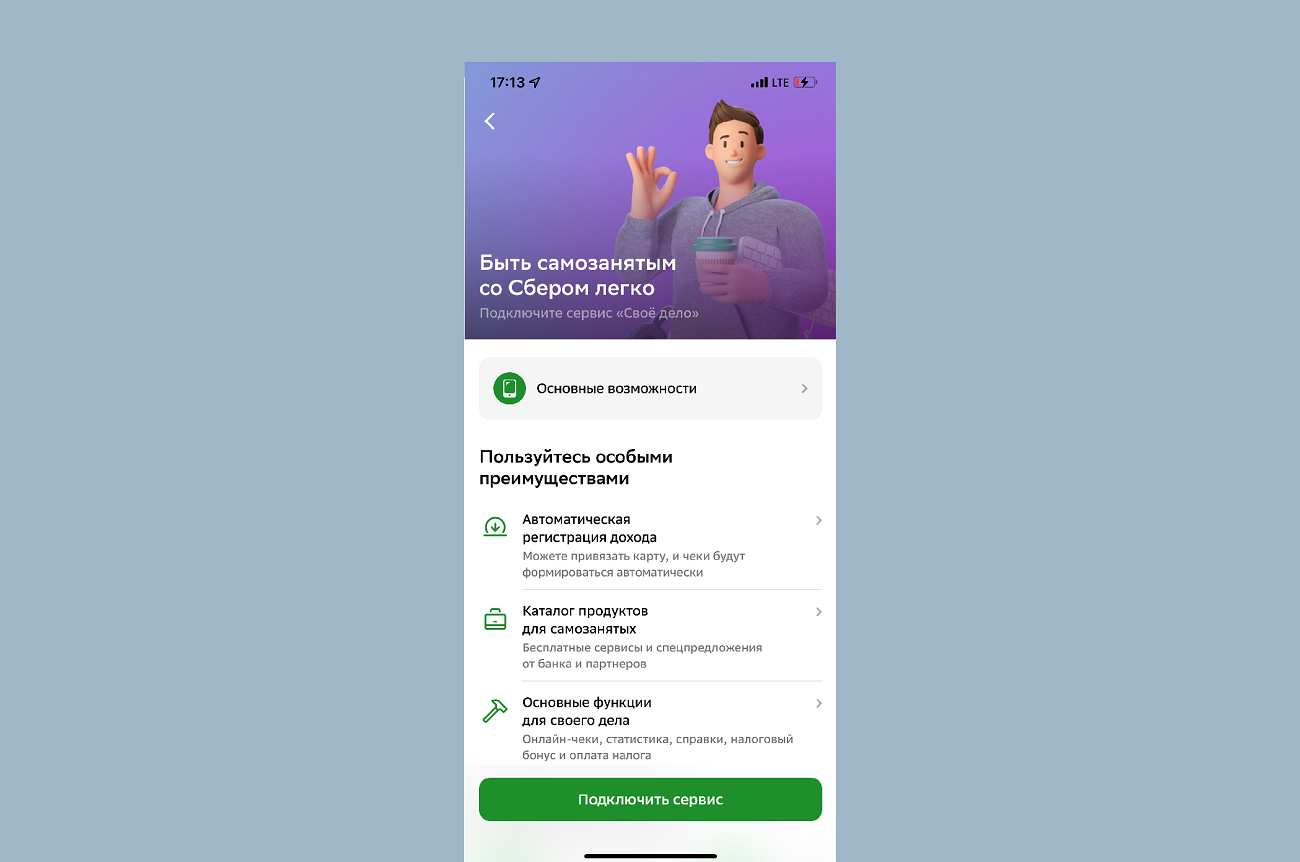 Сервис Сбера «Самозанятость» («Своё дело») в мобильном приложении заменяет кассовый аппарат и позволяет вести всю отчётность. В нём можно отслеживать статистику доходов и расходов, уплачивать налог, создавать чеки, заказывать справки о постановке на учёт или о доходах.