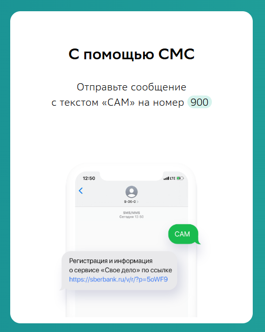 Кроме того, подключить сервис можно по СМС. Если вы уже клиент Сбера, отправьте сообщение с текстом «САМ» на номер 900. Вам придёт ссылка для регистрации в сервисе.