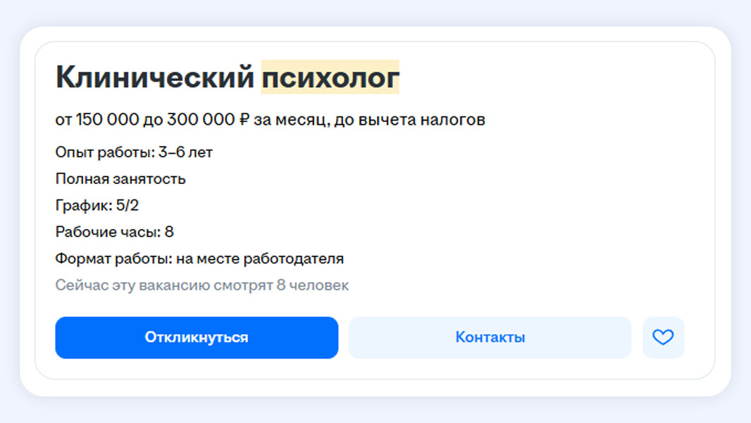 Сколько можно заработать: от 150 000 рублей, в зависимости от специфики и направления работы специалиста. Чем уже специализация психолога, тем выше его доход. Например, есть семейные, детские, школьные, спортивные, корпоративные, социальные психологи. Ещё выше зарплата у клинических психологов — они диагностируют и корректируют психологические состояния, связанные с психическими, психосоматическими или неврологическими расстройствами.