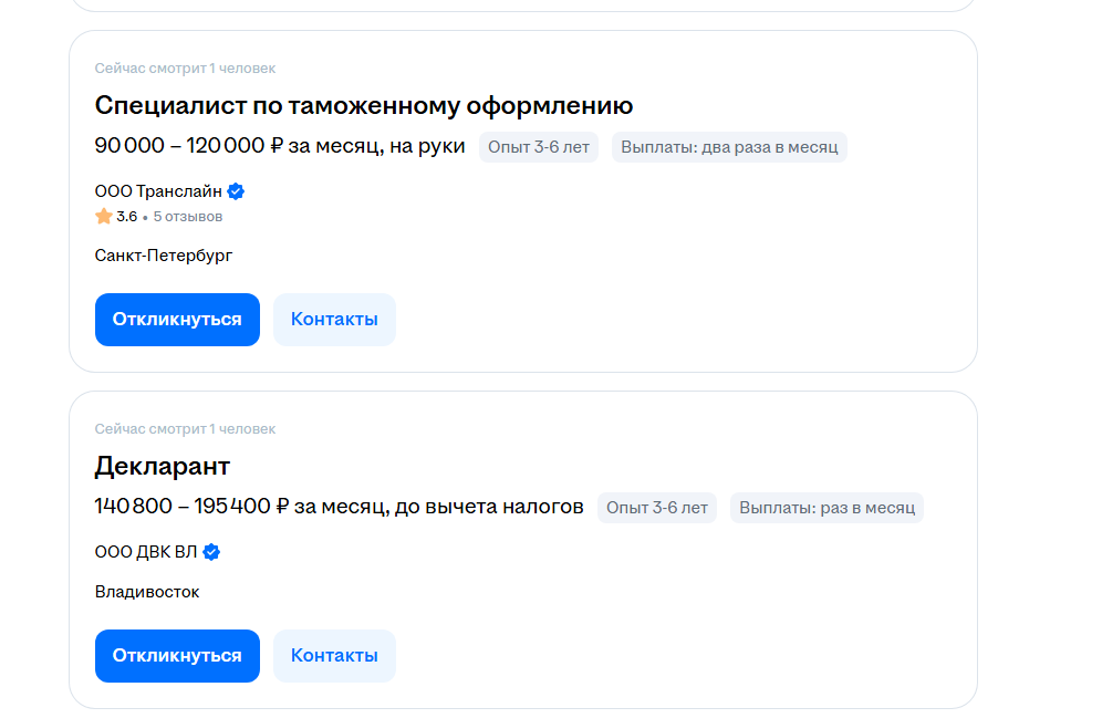 - Работать таможенники могут в государственных органах или частных компаниях. От места работы, а также от опыта, региона и специализации зависит зарплата. В начале карьеры сотрудникам службы платят в среднем от 50 тысяч рублей, а после нескольких лет работы — от 90–100 тысяч.