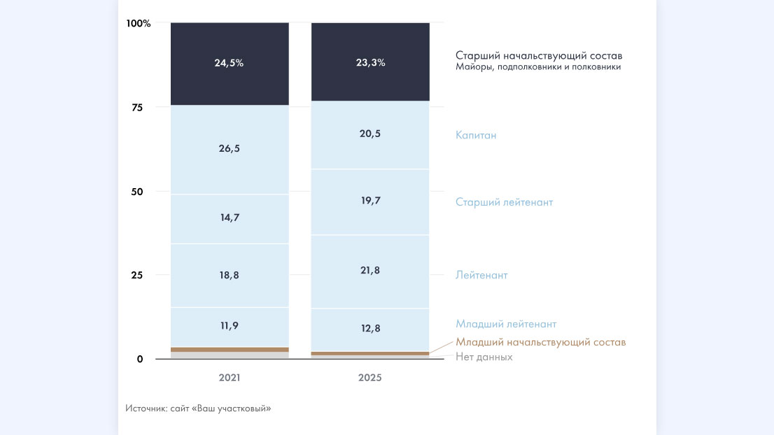 С 2021 года доля капитанов и майоров снизилась, а большинство новых сотрудников приходят на работу в звании лейтенанта.