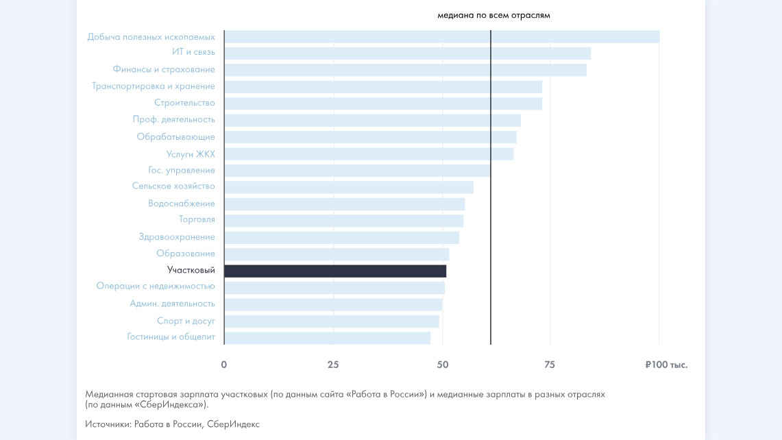 1. Низкая зарплата. В 2025 году зарплата участковых ниже, чем у учителей и врачей. В вакансиях на hh.ru медианная зарплата участковых начинается с 58,5 тыс. рублей, а на сайте «Работа России» этот уровень ещё ниже — 51 тыс. рублей.