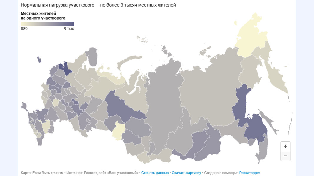 Нормальная нагрузка на одного участкового не должна превышать 3000 жителей на вверенной ему территории. Согласно исследованию «Если быть точным», в настоящий момент эта норма выполняется только в 15 регионах, а в остальных превышает показатель, иногда в 2–3 раза.
