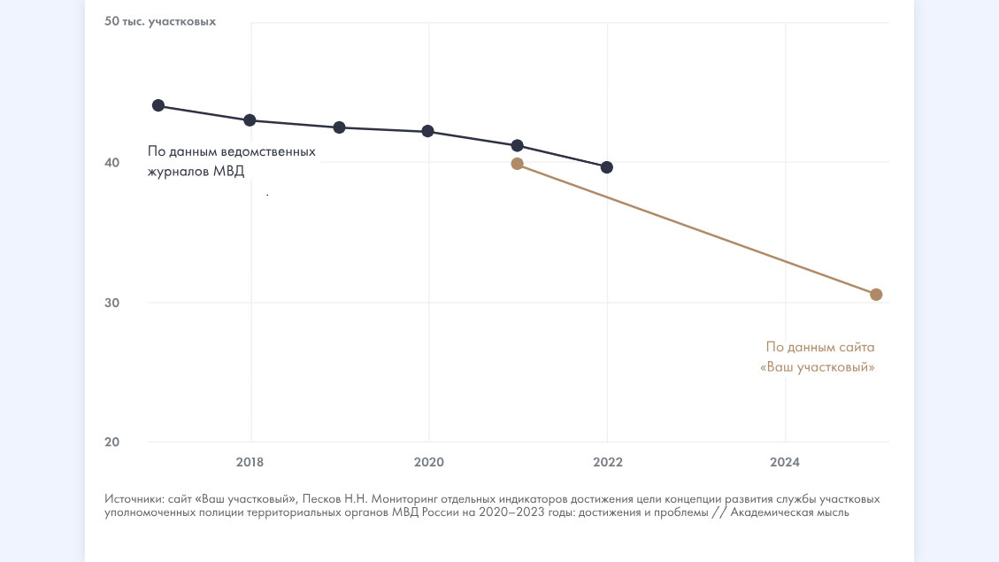 С 2017 по 2022 год количество участковых в среднем сократилось на 800. С 2023 по 2025 год отток ускорился до примерно 4,5 тыс. человек в год. Всего с 2023 года, по оценке исследования, со службы могли уйти 9–10 тыс. сотрудников.