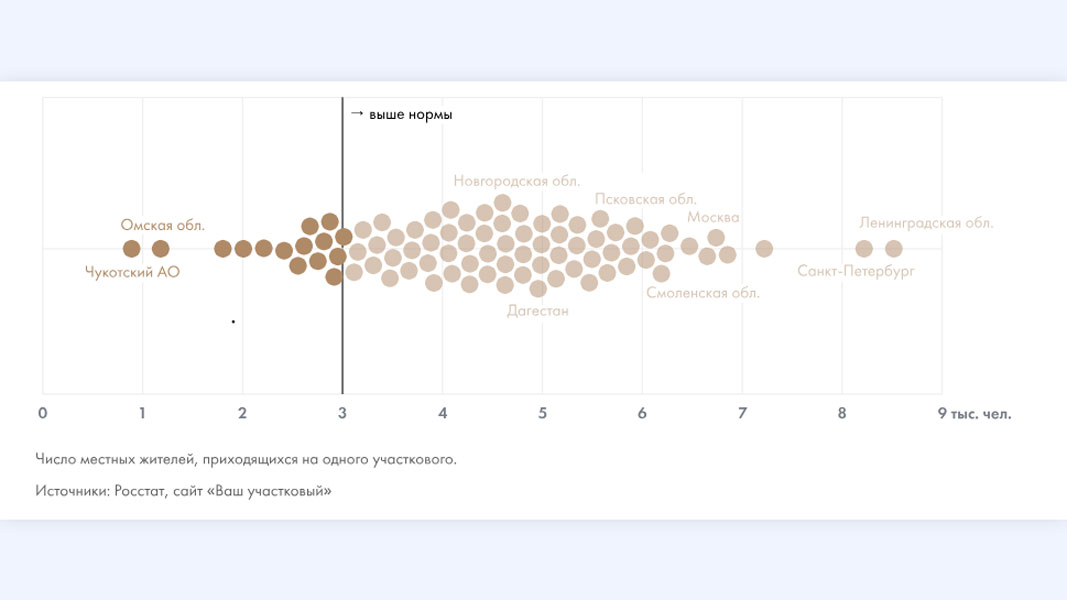 Согласно исследованию «Если быть точным», участковых не хватает практически во всех регионах. Особенно острый дефицит — в Ленинградской области и Санкт-Петербурге, там один участковый обслуживает 8,5 и 8,2 тыс. человек. В Санкт-Петербурге один участковый работает за двоих, в городах Ленинградской области — за семерых.