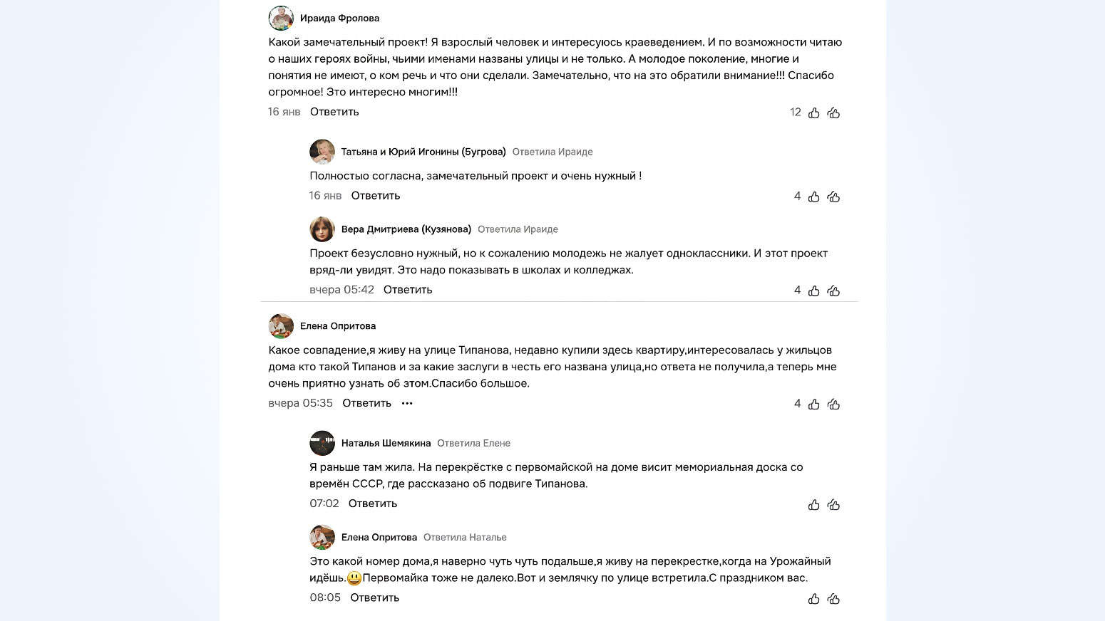 На примере этого проекта можно судить об успешной работе комьюнити-менеджера. Ведь обычный патриотический контент превратился в общественное движение. Ролики из сообщества стали жить собственной жизнью — их начали пересылать в чатах, школах, семьях. Люди благодарили, плакали, писали: «Я впервые узнал, какой человек и какая история стоит за названием моей улицы».