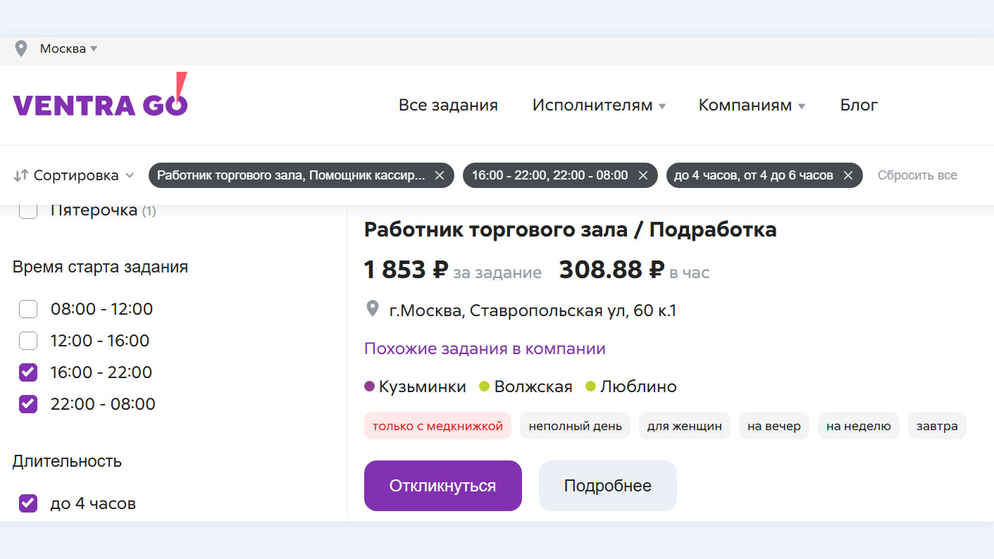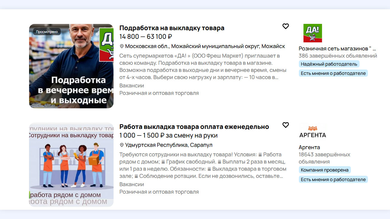 В ретейле тоже есть немало предложений для вечерней подработки. Одна из самых популярных — работник зала, который должен выкладывать товар на полки и следить за сроком годности пищевых продуктов. Такие вакансии предлагают крупнейшие торговые сети и небольшие розничные магазины. Платят сотрудникам за смену или фиксированный оклад. В среднем за смену предлагают 1000–1500 рублей, а за 20 смен в месяц получится заработать от 20 000 до 30 000 рублей.
