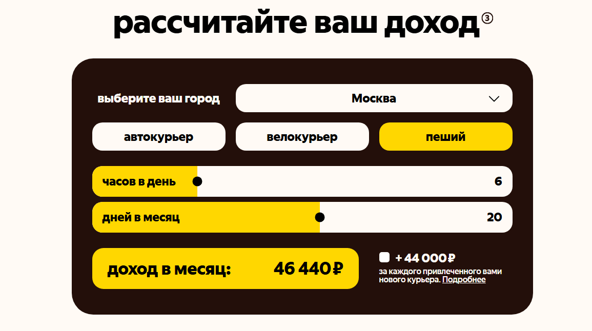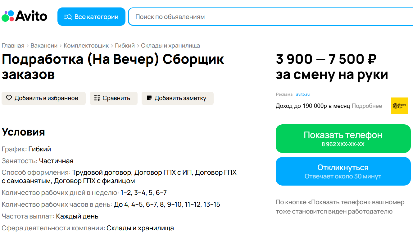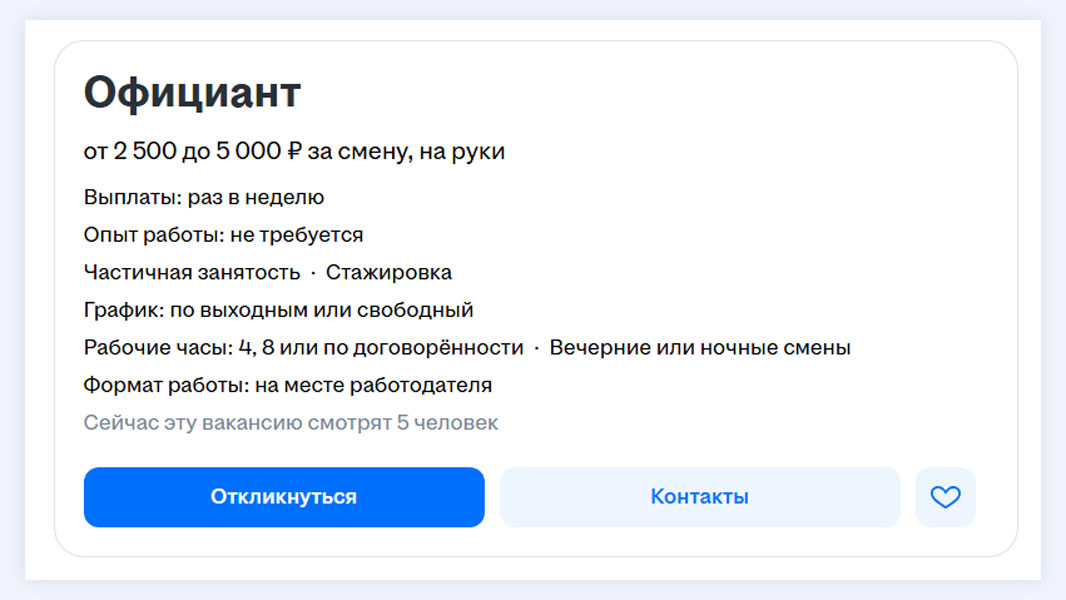 Такая подработка идеально подходит для студентов и молодых людей без образования, а также пенсионеров. По данным «Авито Подработки», в 2025 году компании почти на 30% чаще предлагают подработать курьером пожилым людям. В среднем за это платят 56 000 рублей при неполной занятости. Сколько доставщик заработает на вечерних сменах, зависит от многих факторов: количества часов, типа заказов и условий работодателя.