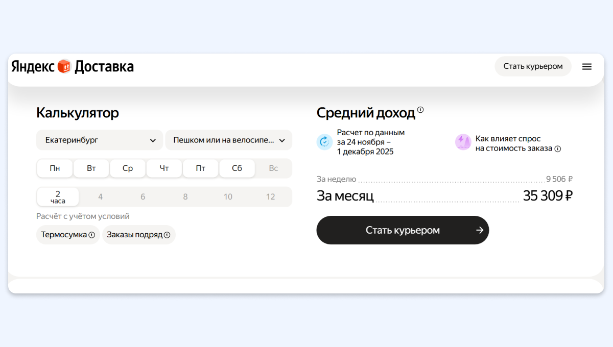Сколько платят. Доход юного доставщика будет зависеть от количества заказов и выбранного рабочего графика. Если ориентироваться на калькулятор сервисов доставки, то, работая пару часов в день, за неделю можно получить порядка 9 тысяч рублей.
