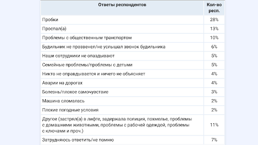 - Основные причины опозданий — пробки, поздние подъёмы утром, проблемы с общественным транспортом.